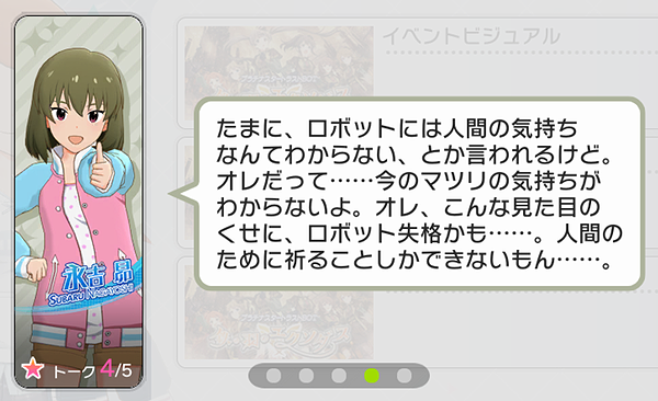ただコミュ中で星梨花が広場に居るのがほとんどロボットで肉まんが売れないと愚痴を言うシーンがあり、多くのロボットは食事をするとするならばこのシーンに矛盾が生じてしまう。