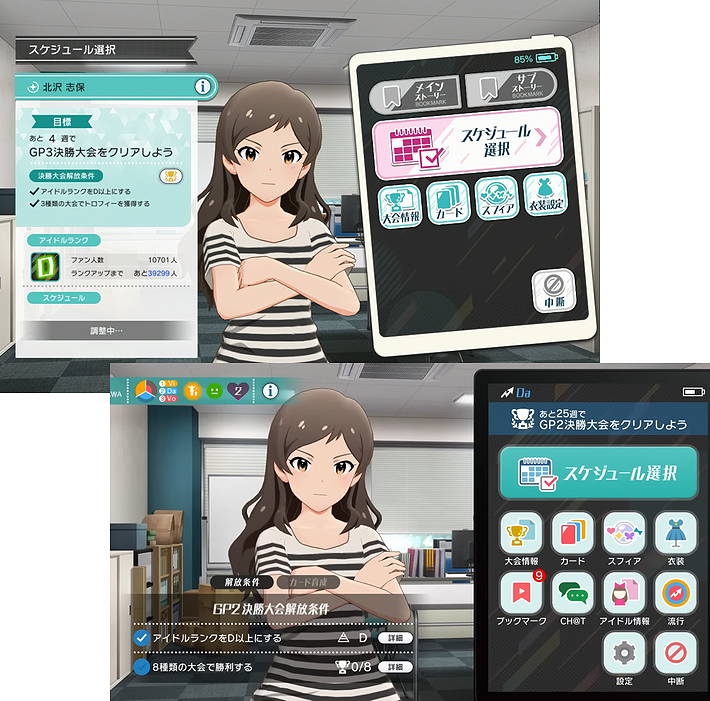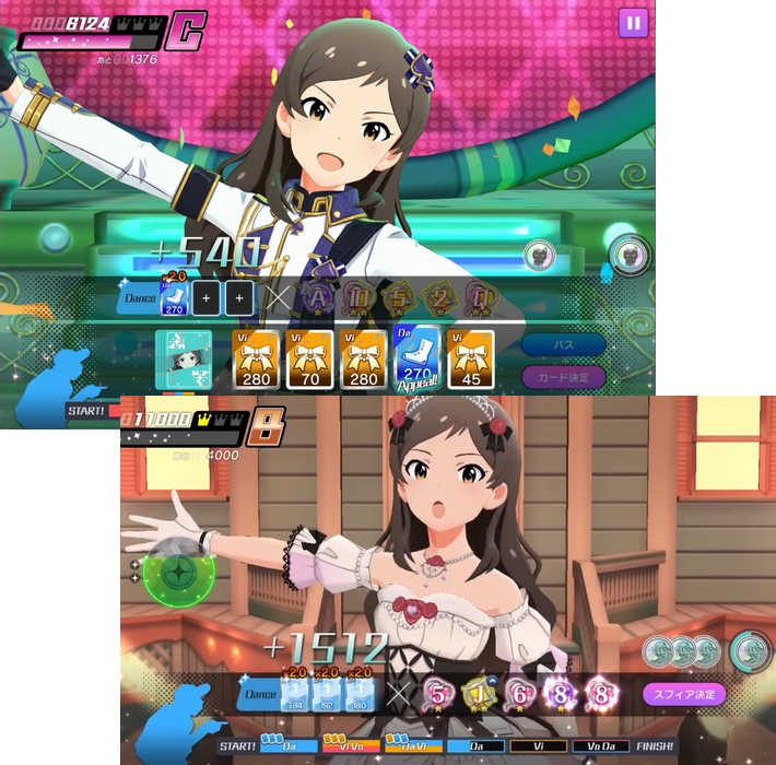 上が以前公開になっていた体験版のプレイ画面で下が今回のプレイ画面。UI結構変わったなあ・・・レッスン画面もまるっきり配置が変わってましたし試行錯誤が続いていることが伺えます。