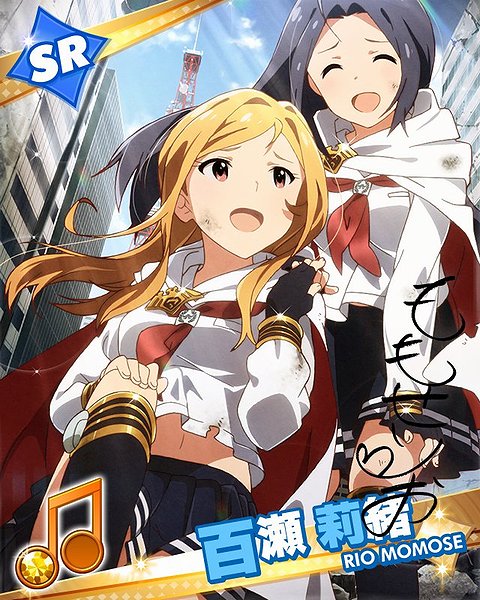 個人的にこのカードがミリシタ始める前から好きな1枚だったのでMVで2人映ってるのを確認した瞬間「ひょお!!」ってなりました。イベント衣装とはブレスレットのデザインやスカートの色が違います。既にミリシタに実装されている百合子のマイティセーラー衣装とも若干違いがありますし、あの戦闘服も年を追う毎に改良されてんですかね。
