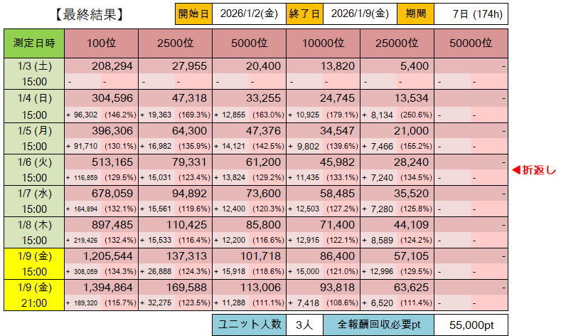 プラチナスターテールのポイントランキングボーダー推移表詳細版です。
