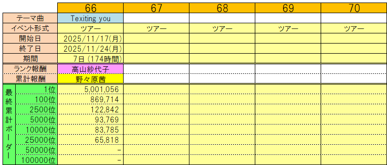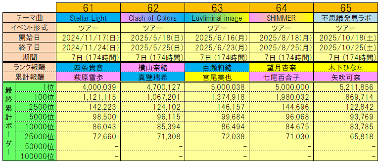 これまでに開催されたプラチナスターツアーの順位別ボーダー・日程・報酬等の一覧です。
