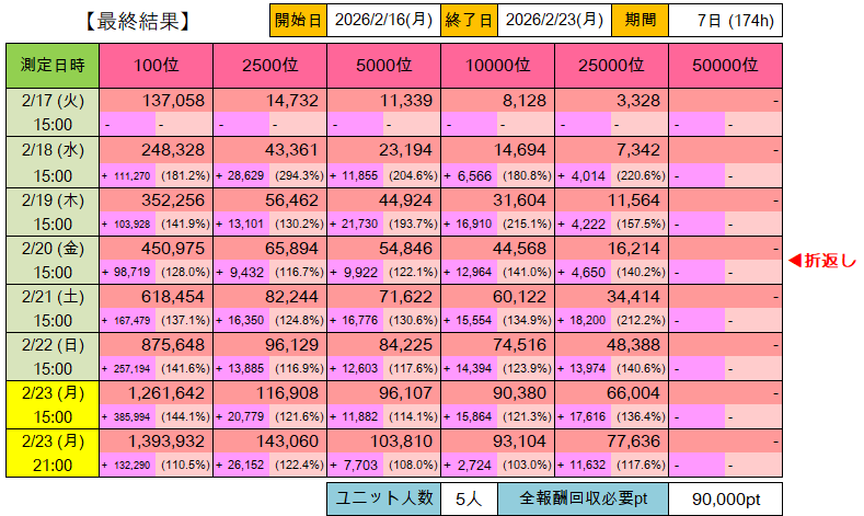 第11回プラチナスターツアー「ビッグバンズバリボー!!!!!」以降のポイントランキングボーダー推移表詳細版です。