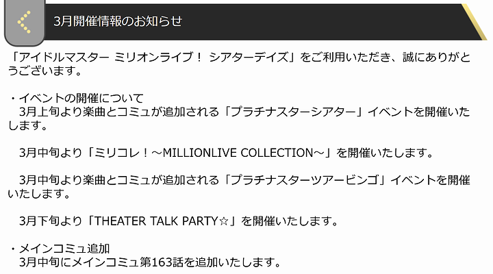 タイミング的にはリンケージもあるかなとか、いよいよ4月に先行版が実装になるアイグラの話題も出るかなんて声も見られたものの、そのあたりの情報は無し。11th直後に生配信あるのではという予想も出ているものの、うーん、タイミング的にはちょっとタイトなのが気になります。どうなりますかね。