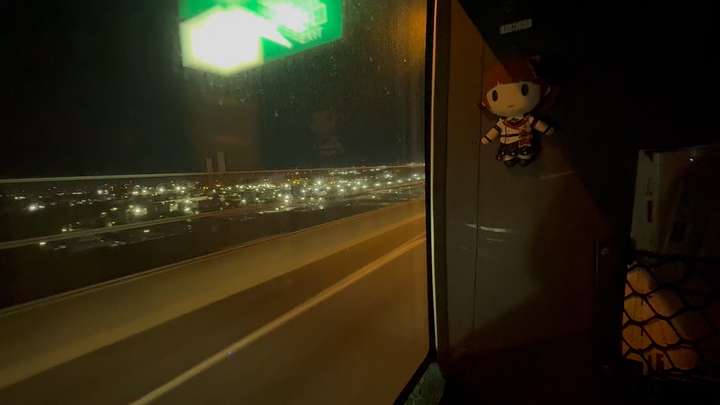 山口県・佐波川SAでの休憩時、車外から振り返ると前席のプレミアムシート壁面に輝くエレナのフルグラ法被。あー、なるほどなー、あれが出来るPの仕草かー・・・と自分も茜ちゃんTシャツをハンガーにかけたりするなか、ここからバスはほぼノンストップで東京めがけ高速道路を東進します。