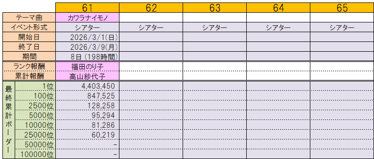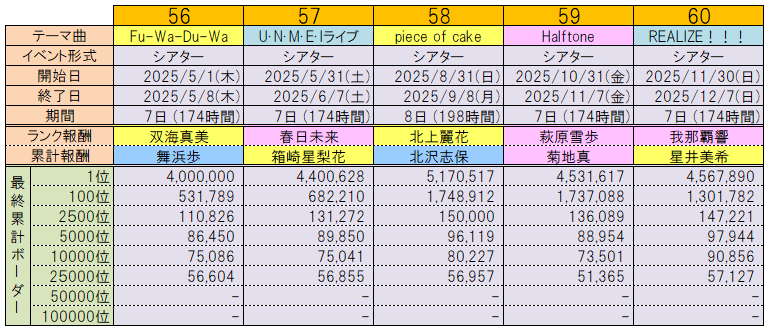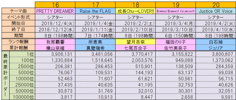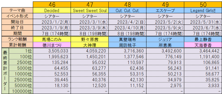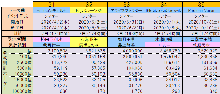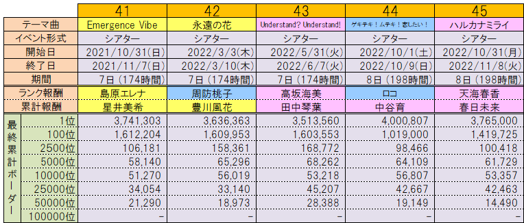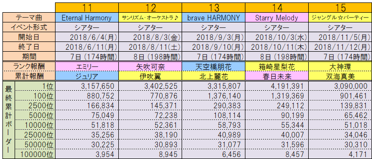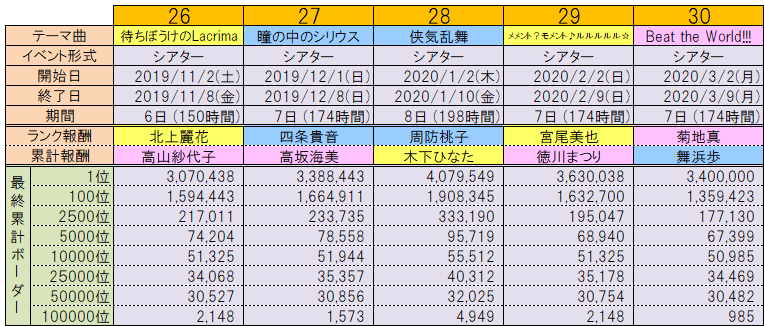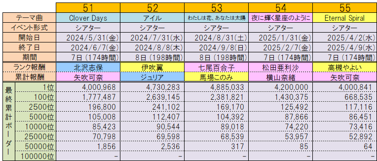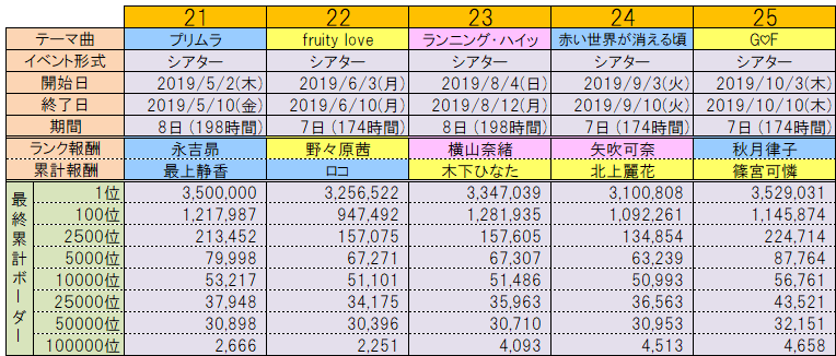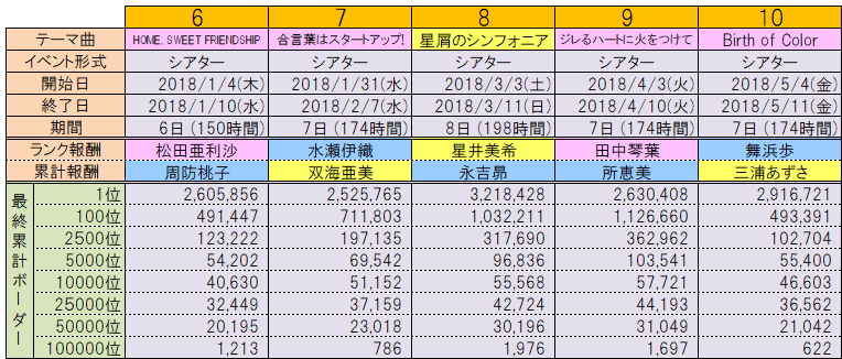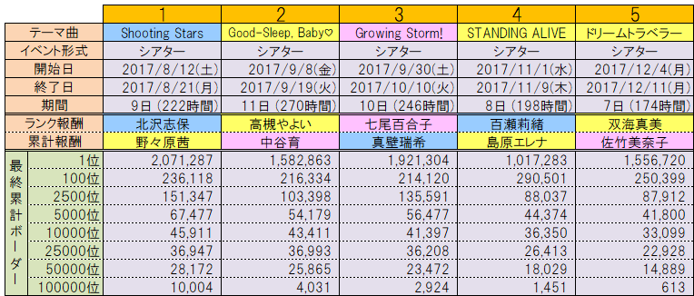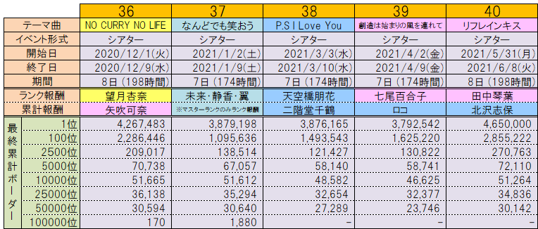 これまでに開催されたプラチナスターシアターの順位別ボーダー・日程・報酬等の一覧です。