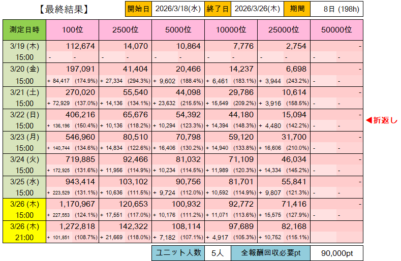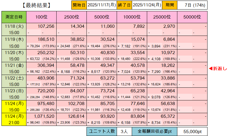 第11回プラチナスターツアー「ビッグバンズバリボー!!!!!」以降のポイントランキングボーダー推移表詳細版です。