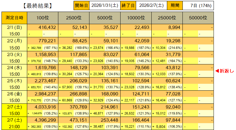 プラチナスタートレジャーのポイントランキングボーダー推移表詳細版です。